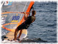 natjecatelja od kojih 4 najbolja idu dalje u sljedeći krug, iz njega ide se dalje u polufinale, pa zatim u finale sa 8 najboljih takmičara. Start regate je "leteći", tj. nakon početka startne procedure natjecatelj ima 3 minute da se pripremi za što bolji prolazak preko zamišljene startne linije između dvije bove postavljene paralelno sa smjerom vjetra. Idealan start je, naravno, prolazak preko linije u punoj brzini, točno kad odbrojavanje te tri minute završi i digne se zelena zastava koja označava start. Koriste se daske od stotinjak litara i jedra od oko 7m2. Za početak je sasvim dovoljna jedna obična freeride daska (koju vjerovatno svi već imate) i jedno freerace ili freeride jedro. Što se tiče same utrke, slalom je nešto zahtjevnija disciplina jer se vozi na jačem vjetru, a najvažnije su kvalitete dobra brzina bočno na vjetar, precizan start i siguran okret niz vjetar. Naravno, na slalomu se okreti izvode isključivo niz